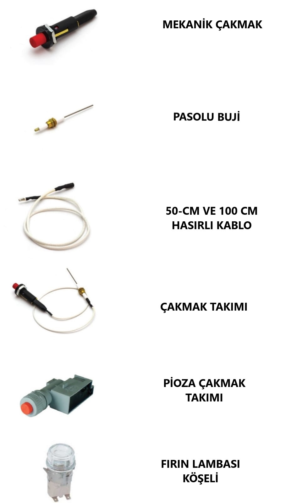 Rezistanslar, termostatlar, gaz valfleri, brülörler, ateşleme bujileri. |